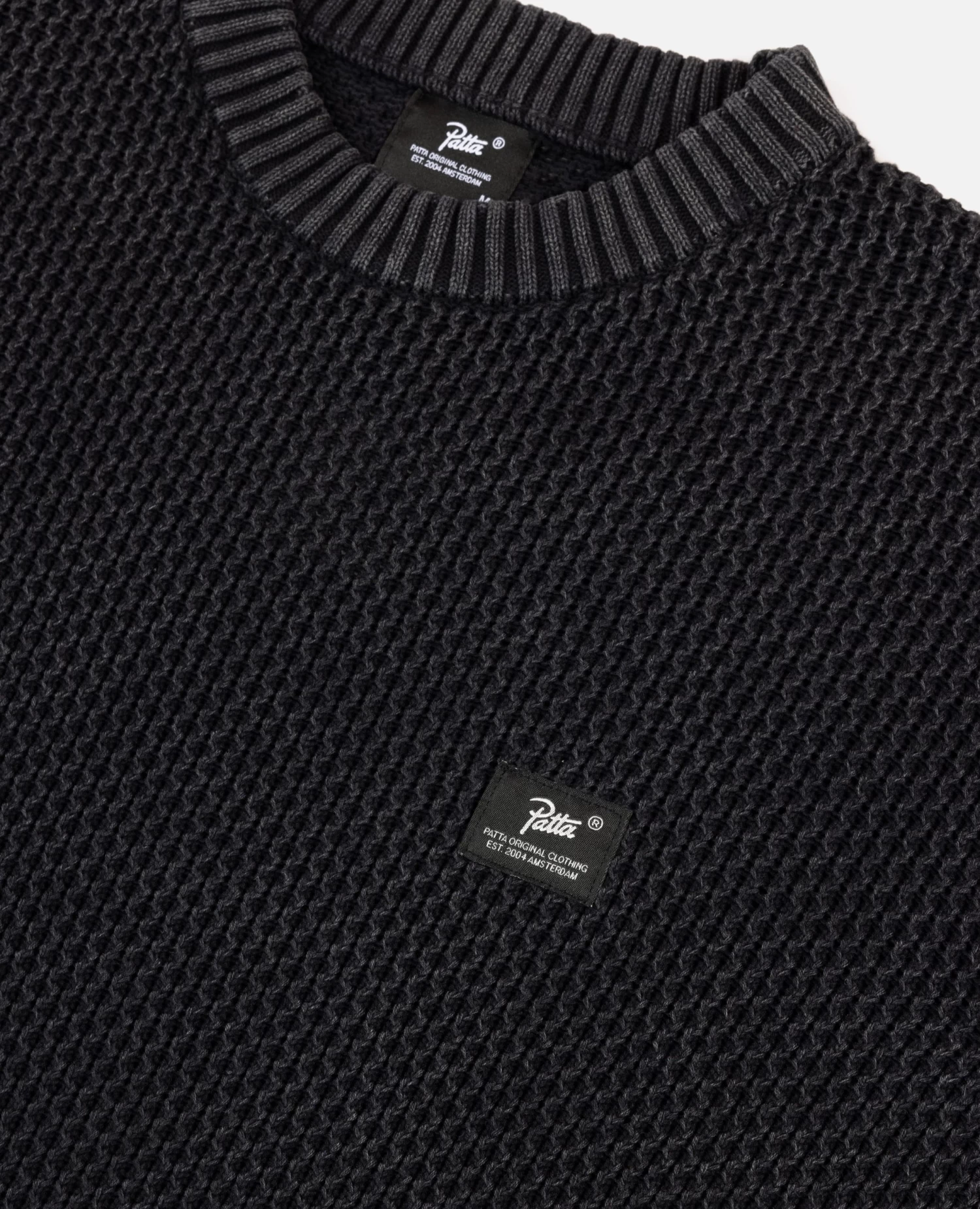 The Patta Honeycomb Knitted Sweater is produced in 100% Cotton with a cold dye wash. The knitted sweater features a honeycomb texture and is equipped with 2×2 ribbings at the cuffs, neck and chest. A Patta woven patch sits on the left hand side of the chest.