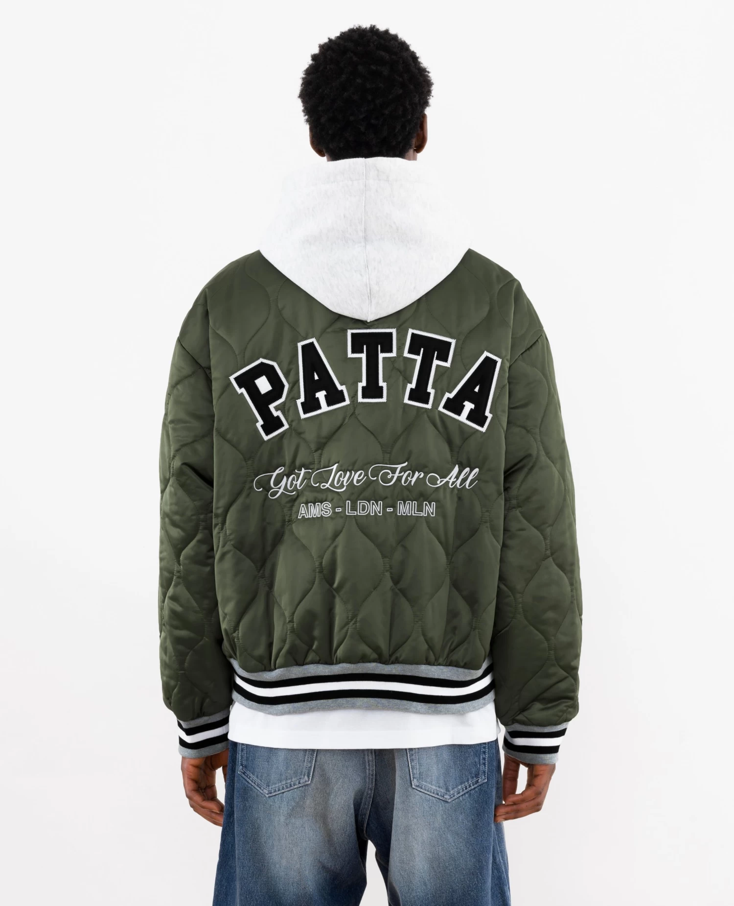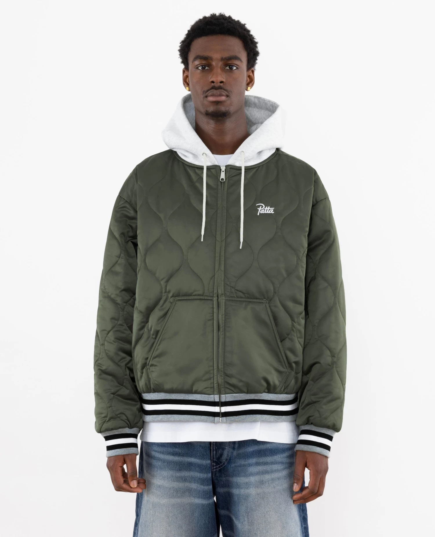 The Patta Hooded Quilted Jacket is crafted in a 80% Cotton and 20% Polyester blend with a 100% Patta branded Polyester lining. The bomber features a contrasting grey hood with drawstrings, two side pockets, an inside pocket and striped hems. The back features applique Patta branding and the front is finished with a subtle embroidered script logo on the left hand side of the chest.