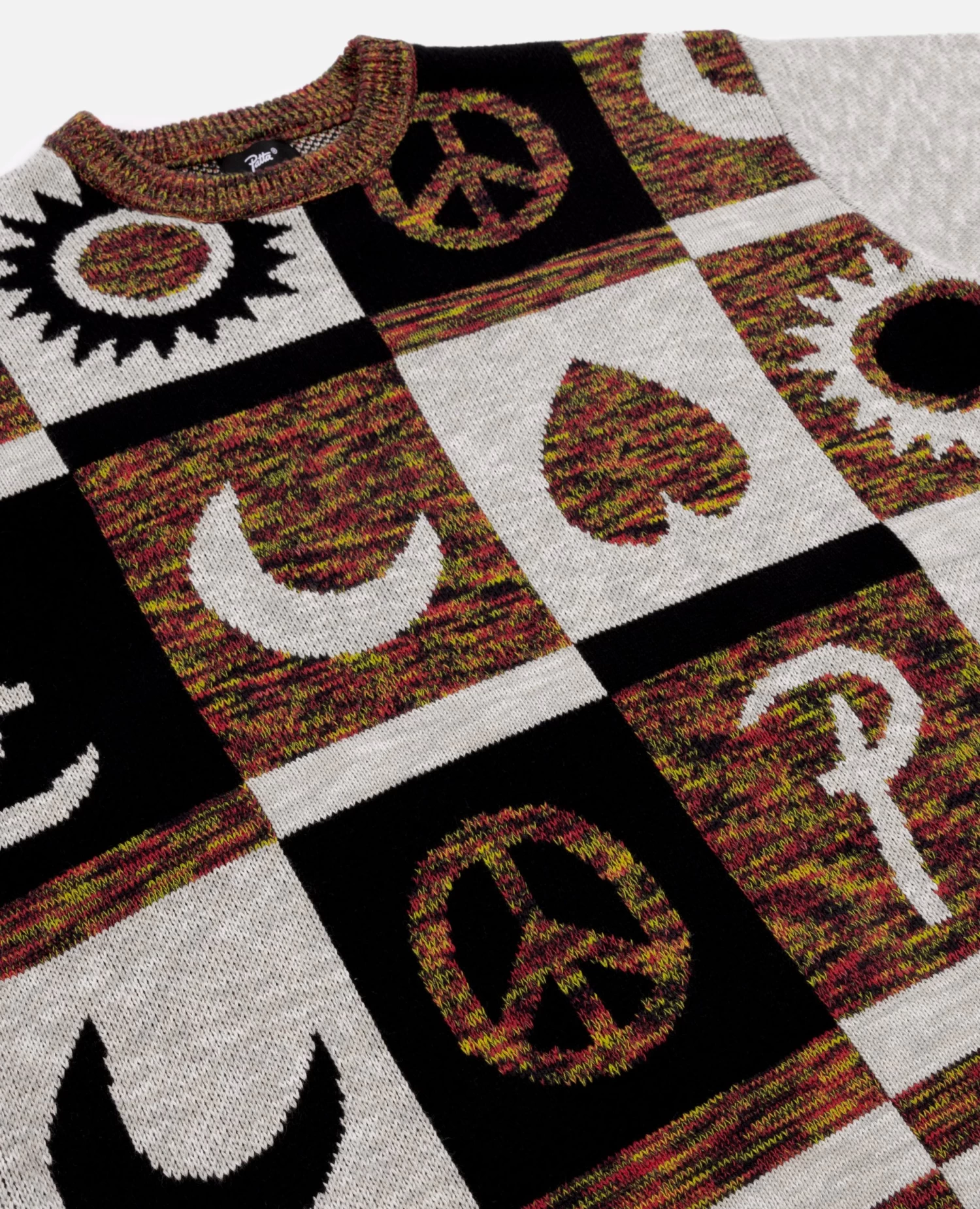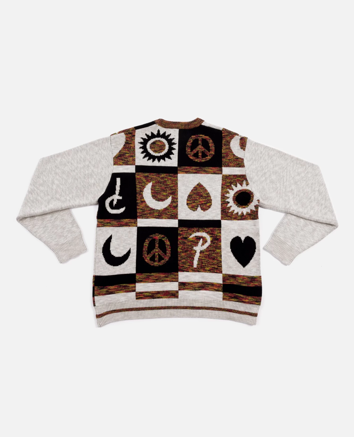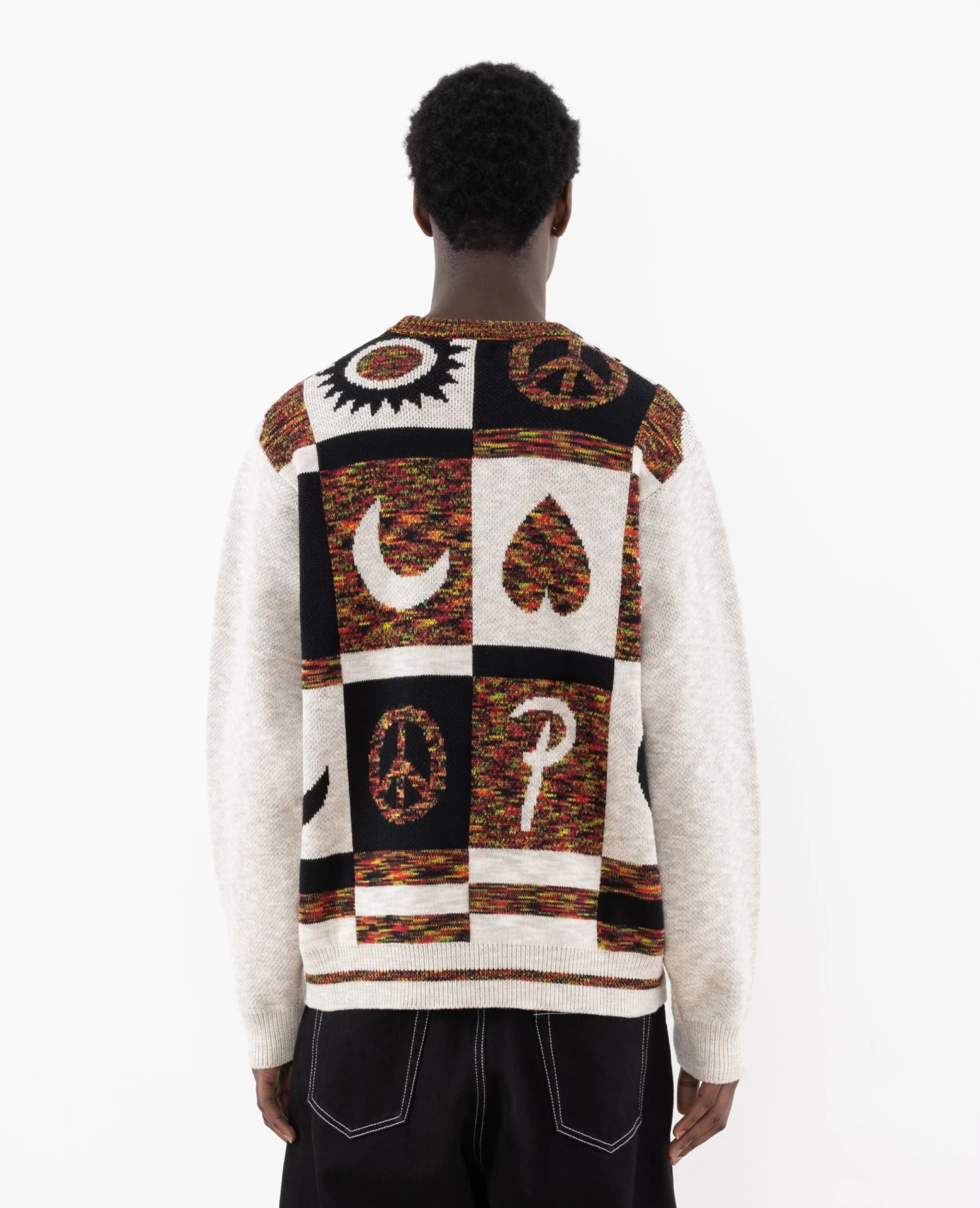 The Patta Knitted Crayon Jumper is crafted in 100% Cotton with Jacquard Space Yarn panels allover. The Knit is fitted with ribbed hems and cuffs. Adorned with large script ‘P’ logo’s allover and various symbols.