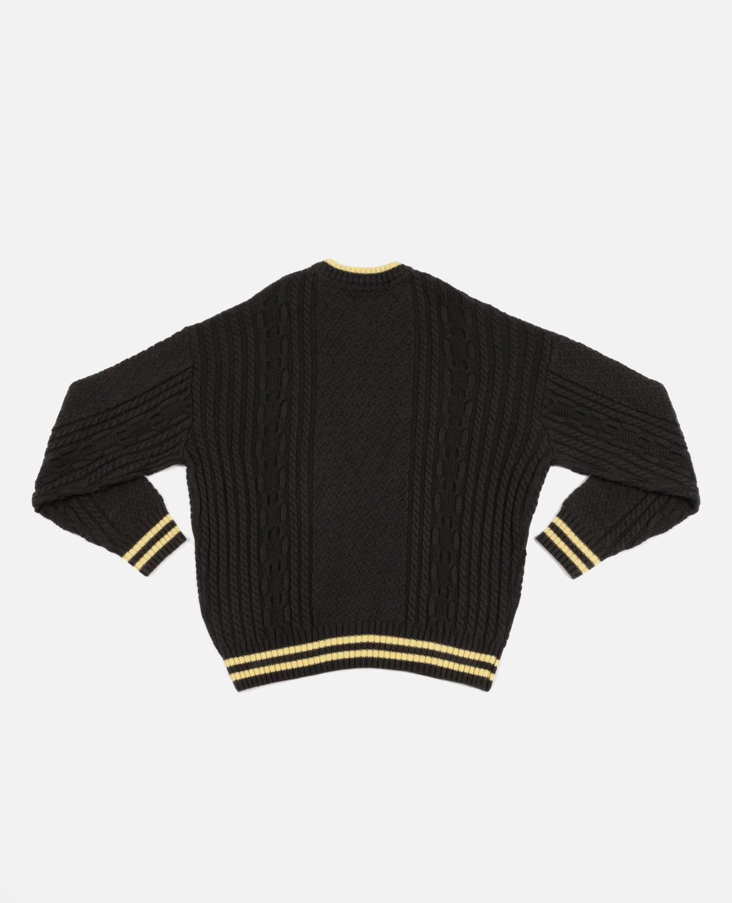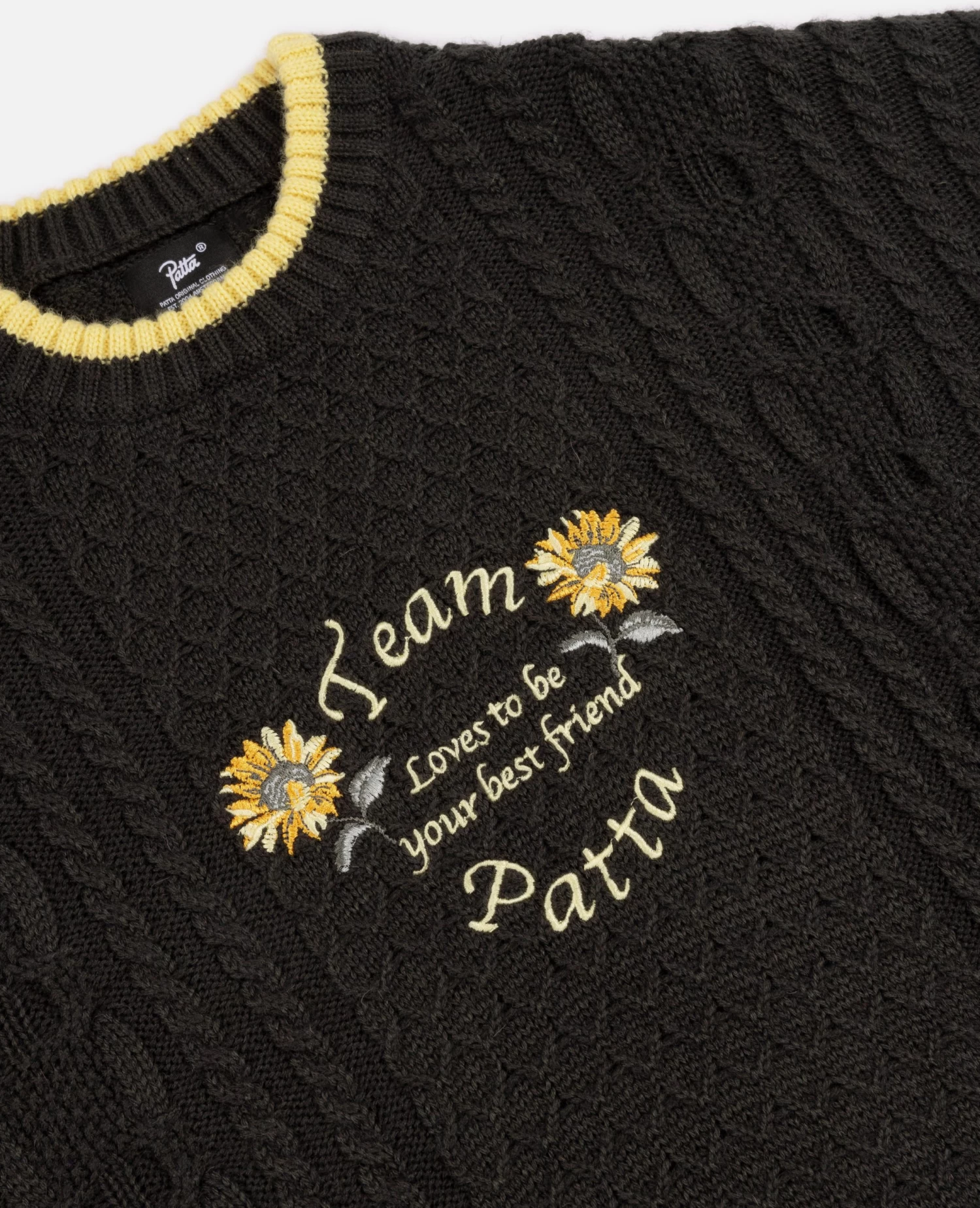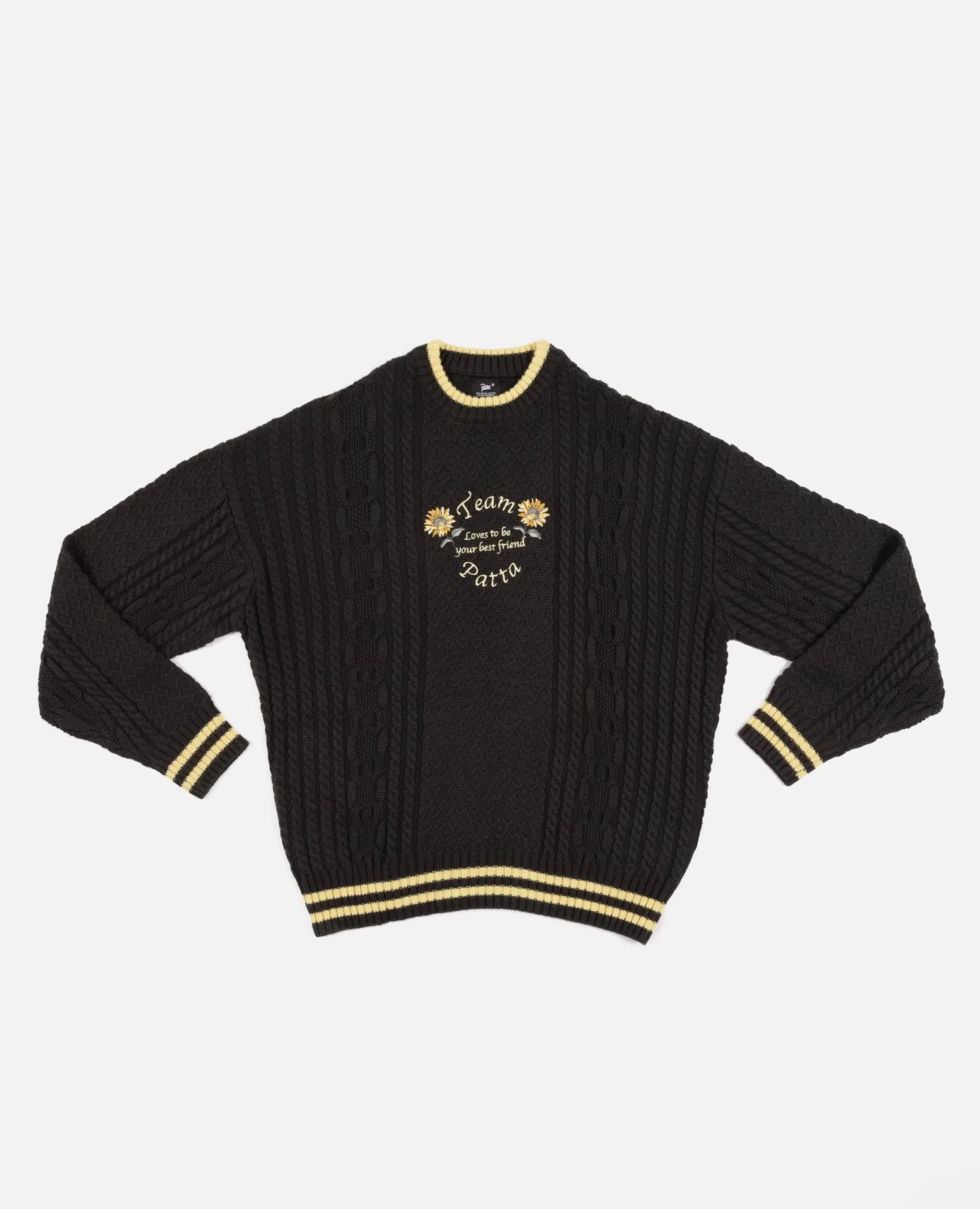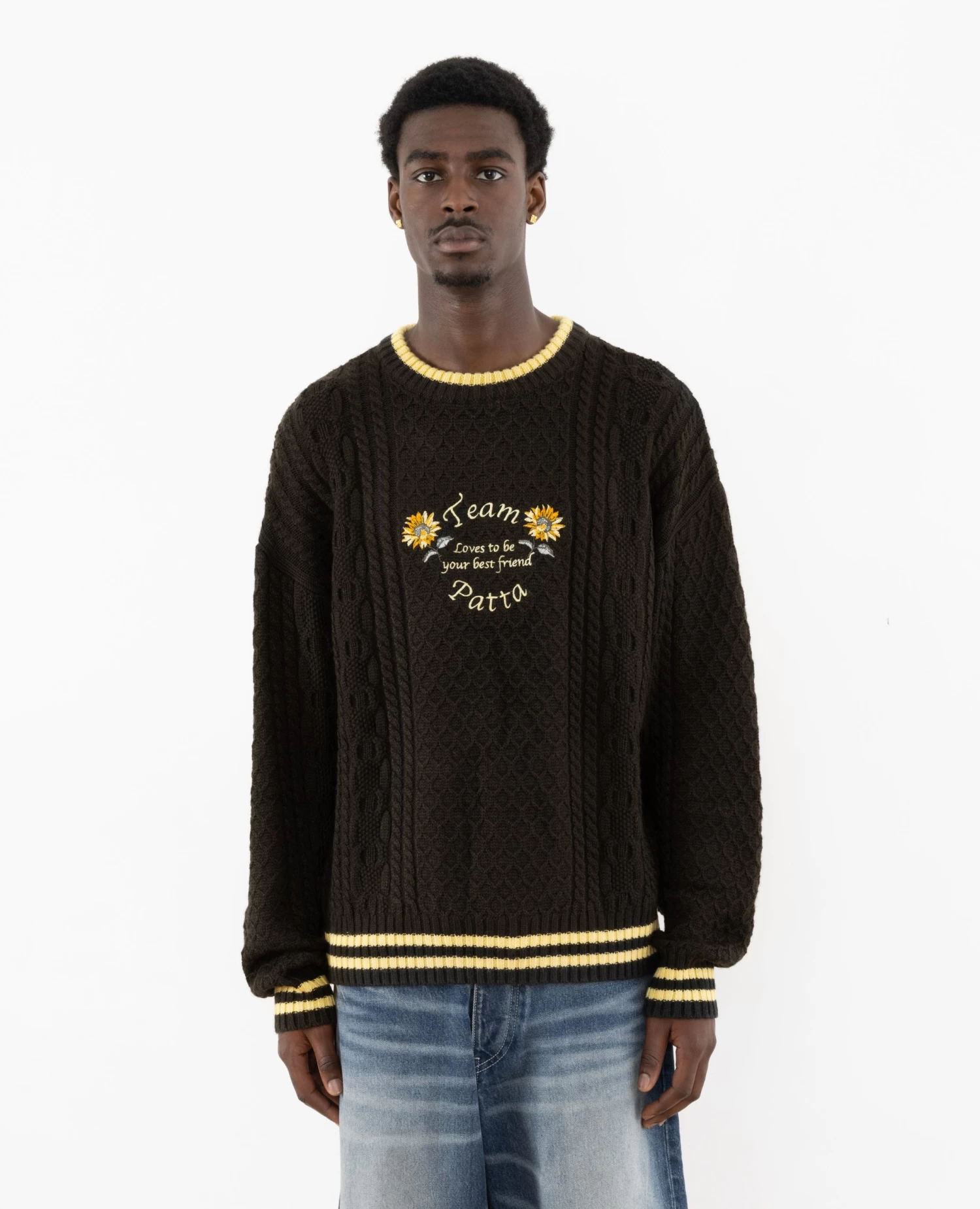 The Patta Loves You Cable Knitted Sweater is produced in 30% Wool and 70% Acrylic blend and is garment pigment dyed. The knit features a ribbed collar, and striped self fabric cuffs and hems. The front of the piece sees a contrasting premium quality Team Patta embroidery’ on the centre chest.