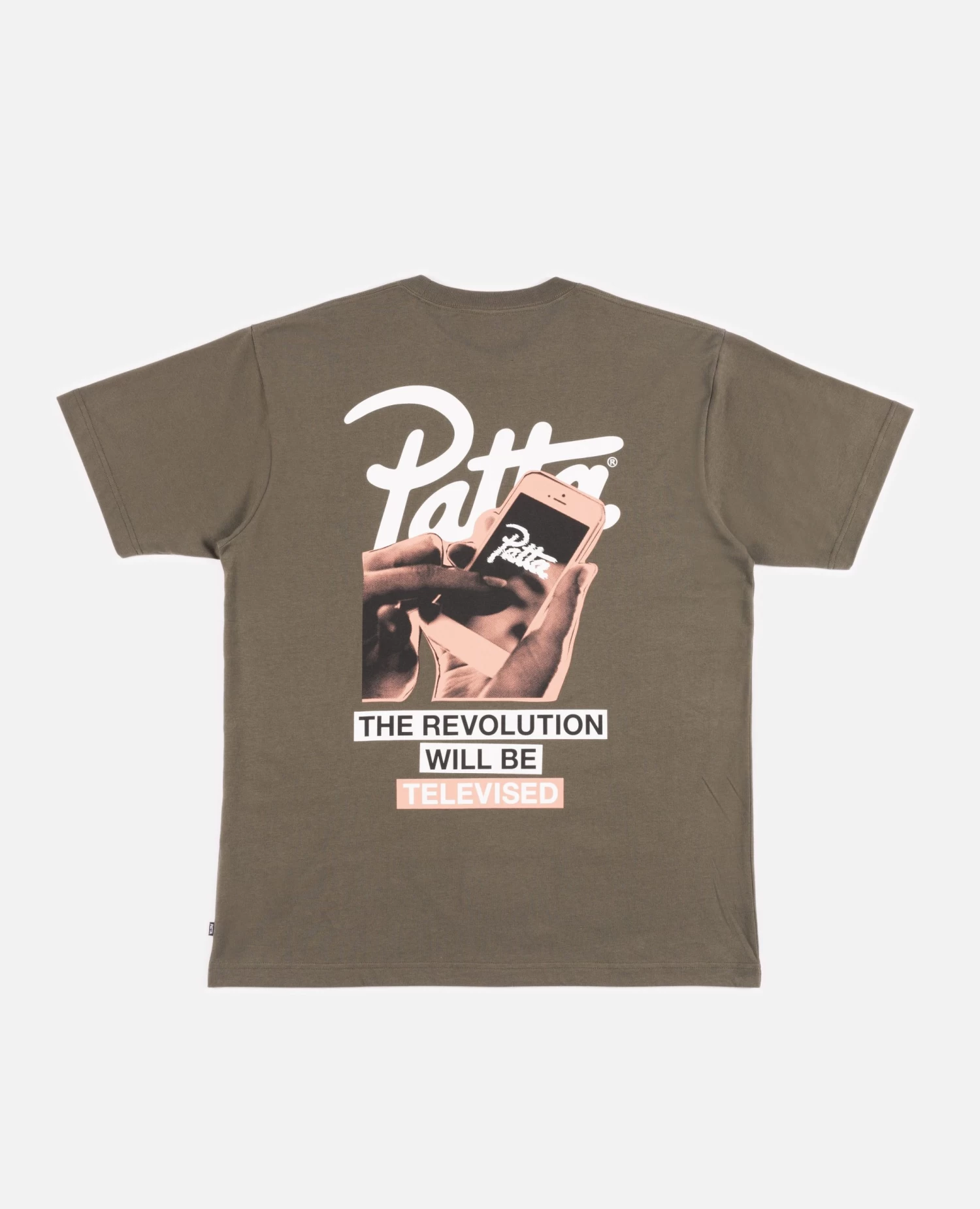 The Patta Revolution T-Shirt is produced in 180gsm cotton. It features a screenprinted Patta script logo at the left hand side of the chest. The back is adorned with a screenprinted Revolution artwork. Available in three iterations.