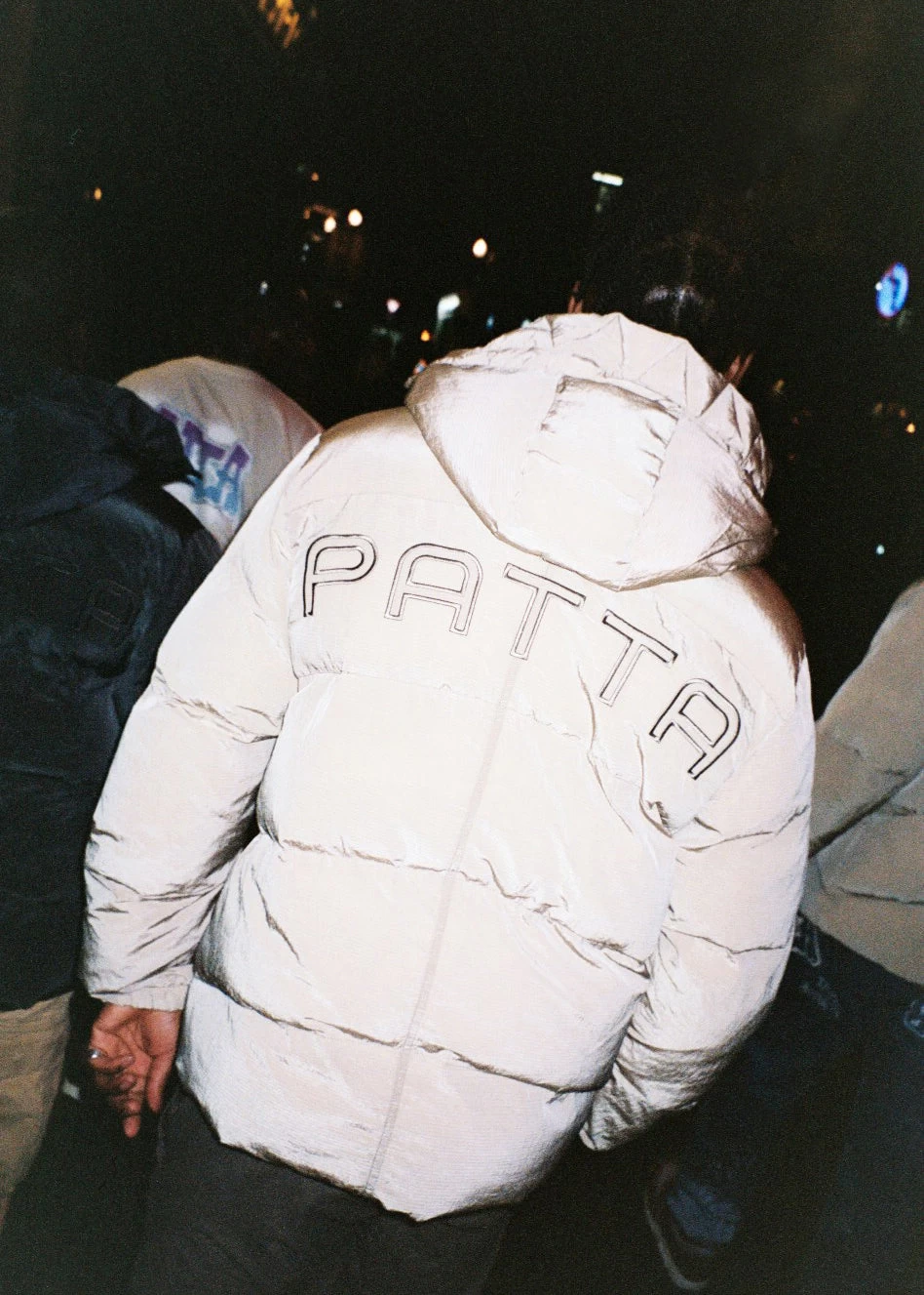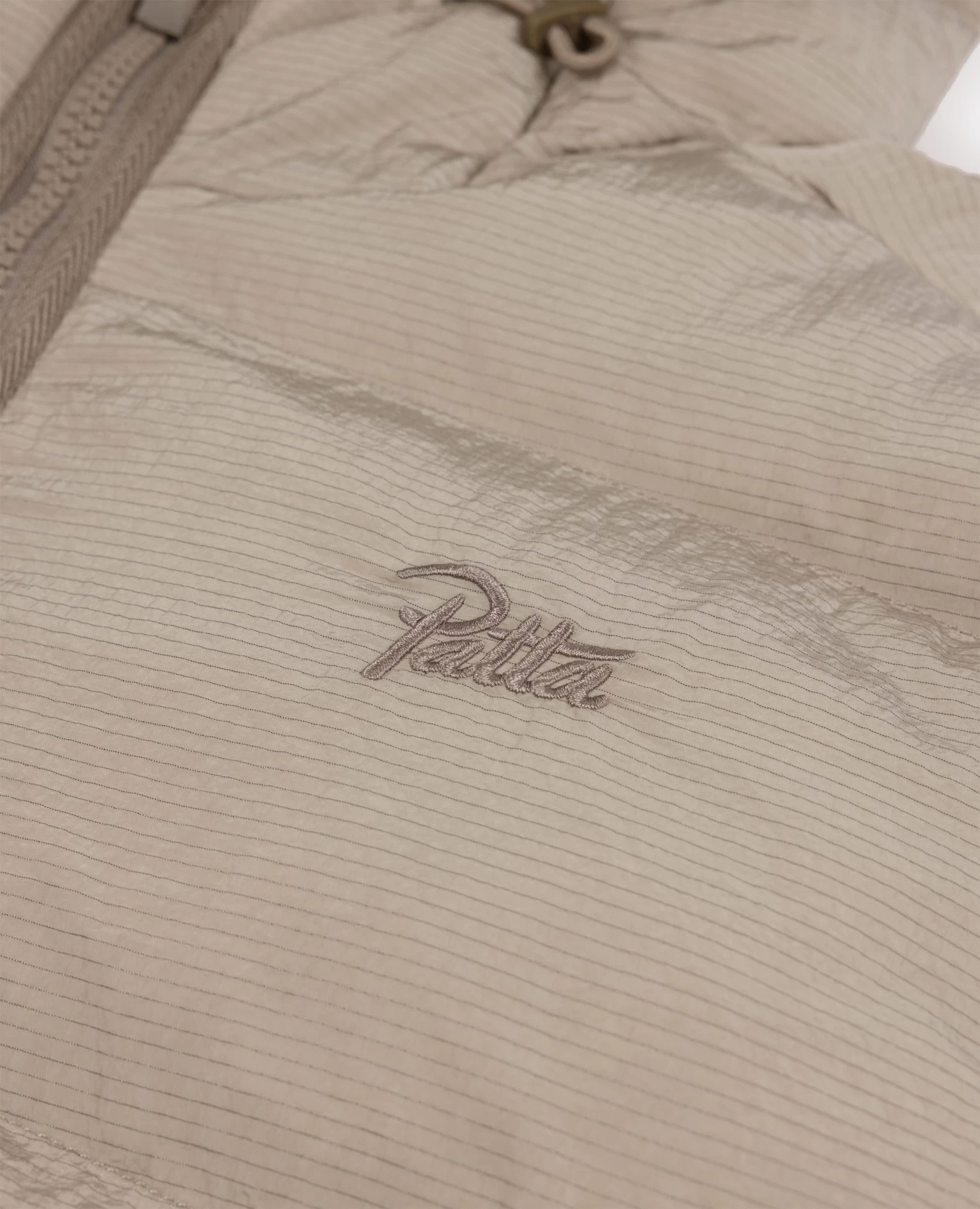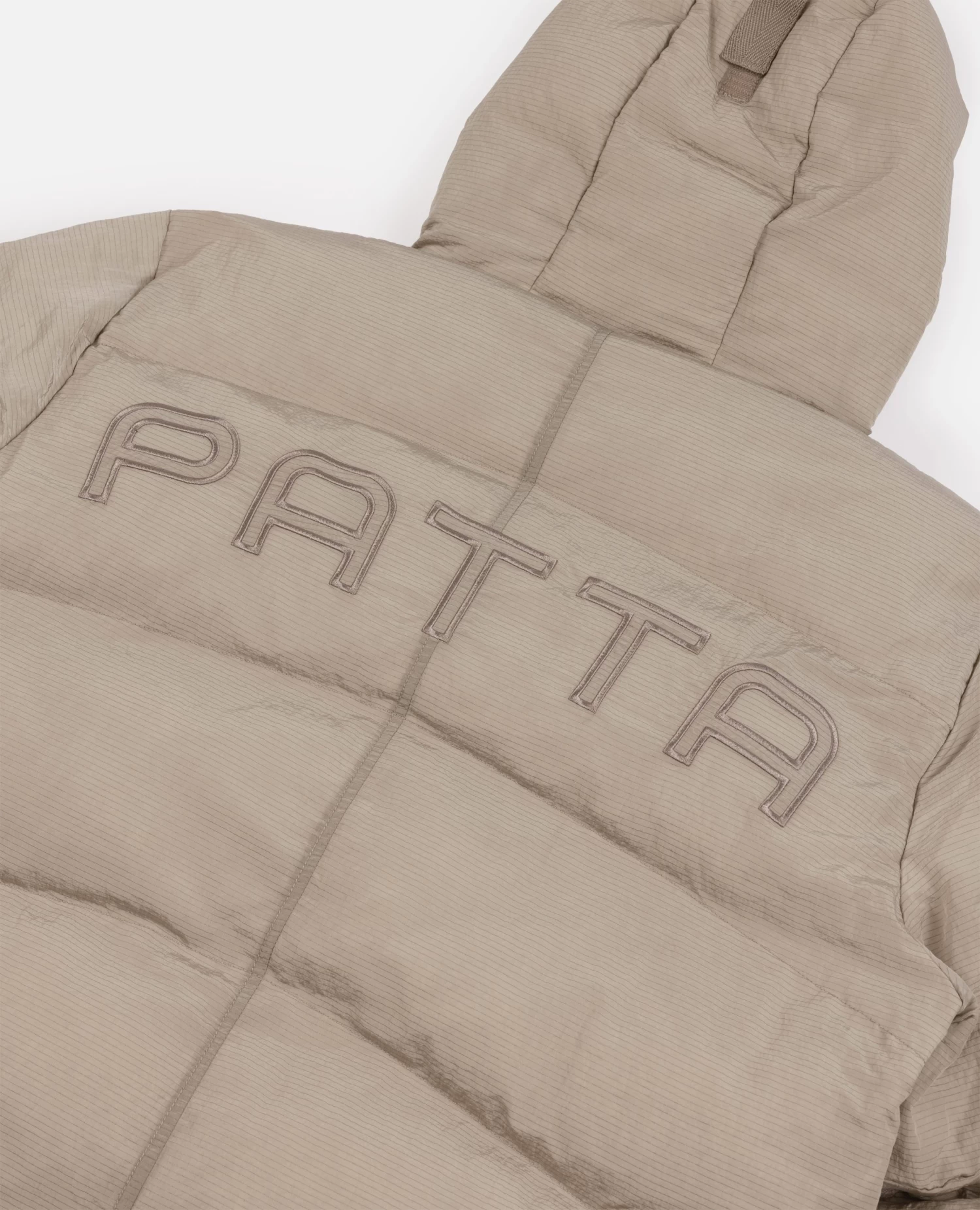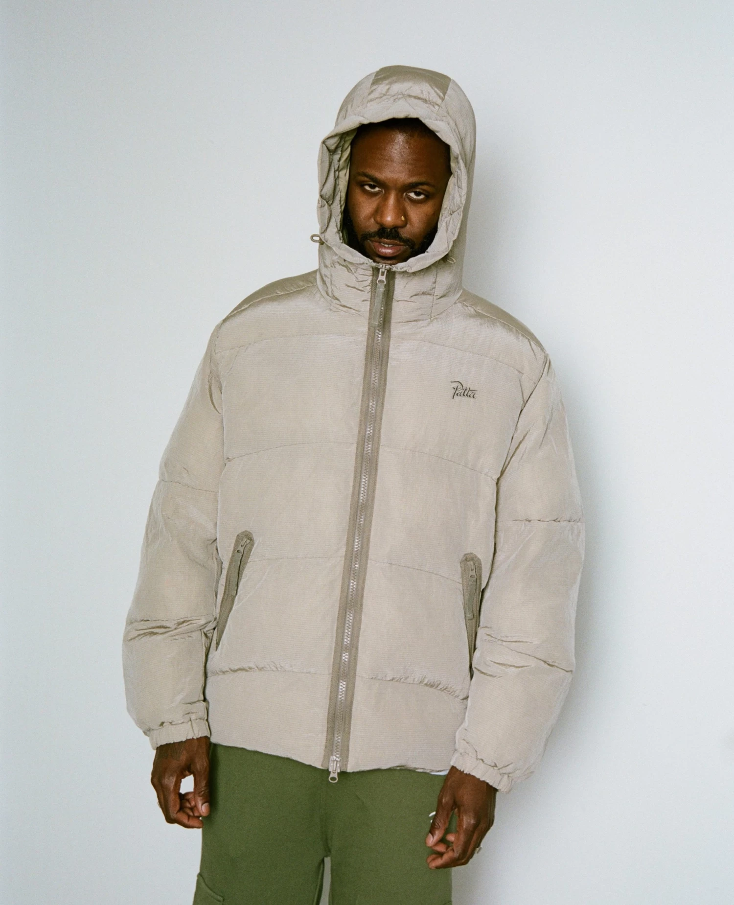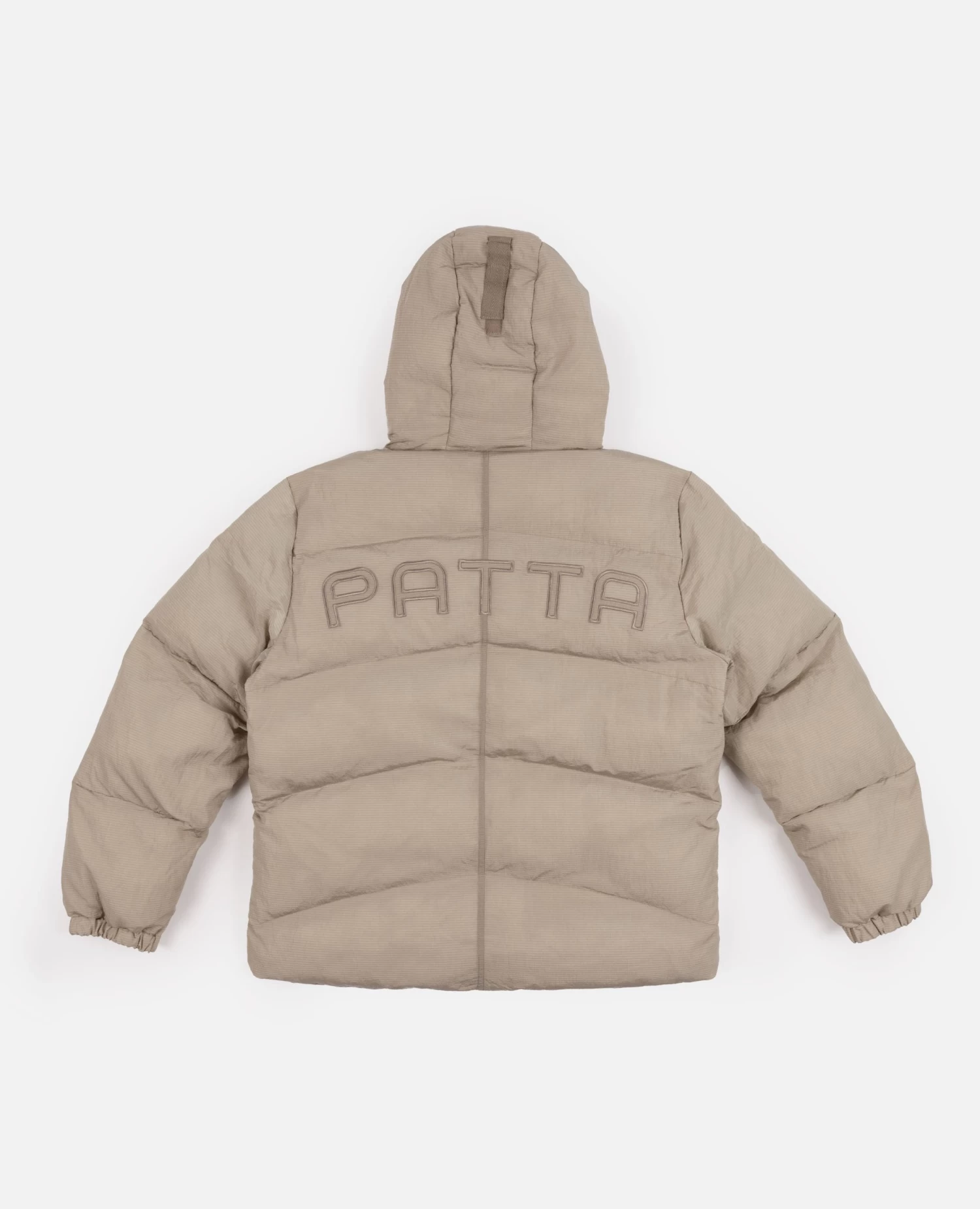 The Patta Ripstop Puffer Jacket is produced in 100% Polyamide crinkly Ripstop with a Metallic effect. The inside features 100% Polyamide quilted lining with 100% Polyester padding. The hood features elastic cords and Woojin cordlocks for resizing. A YKK Vislon two-way main zipper is used for closure with elasticated pullers. The Ripstop Puffer is provided with two side pockets and an inside pocket with zippers. The front side is adorned with a Patta POC patch over on the left hand side of the chest with the back featuring a large Patta embroidery.