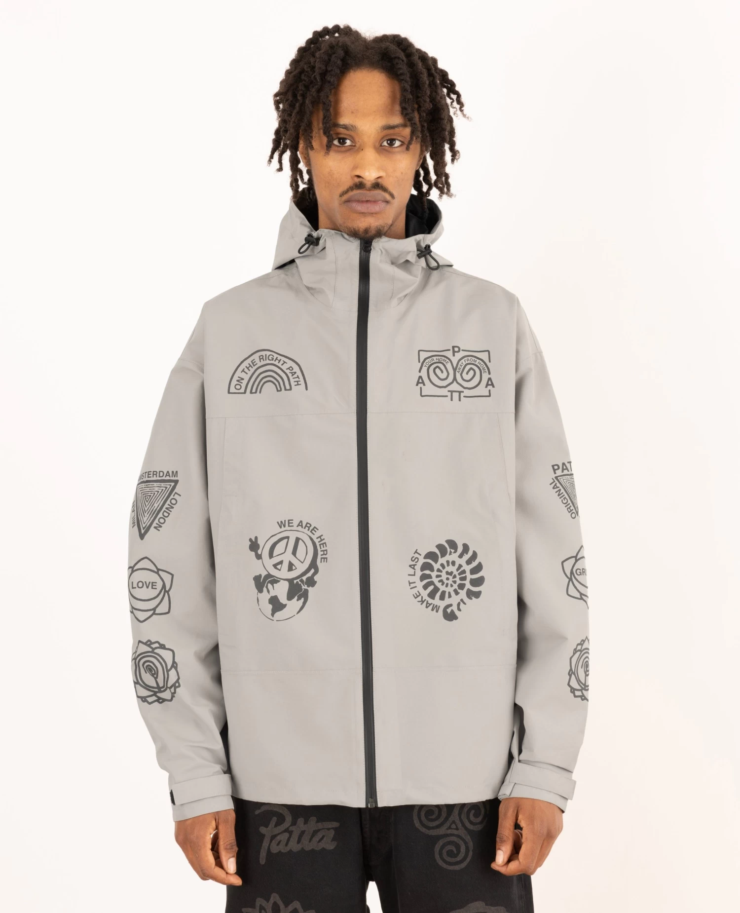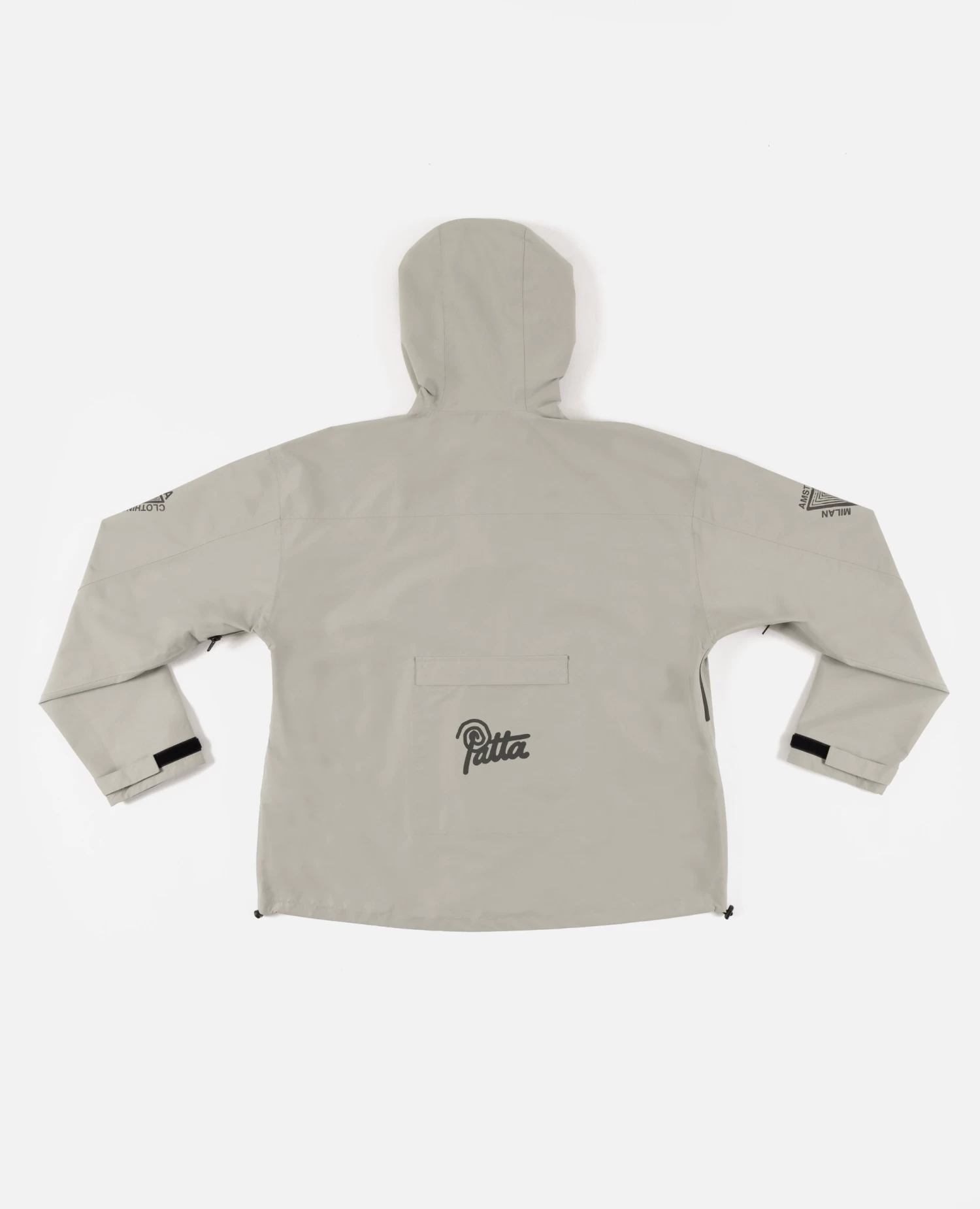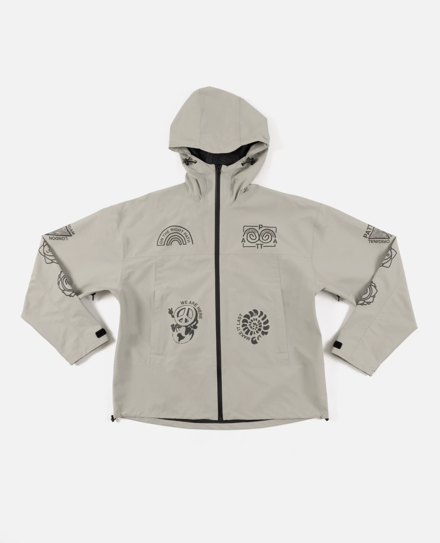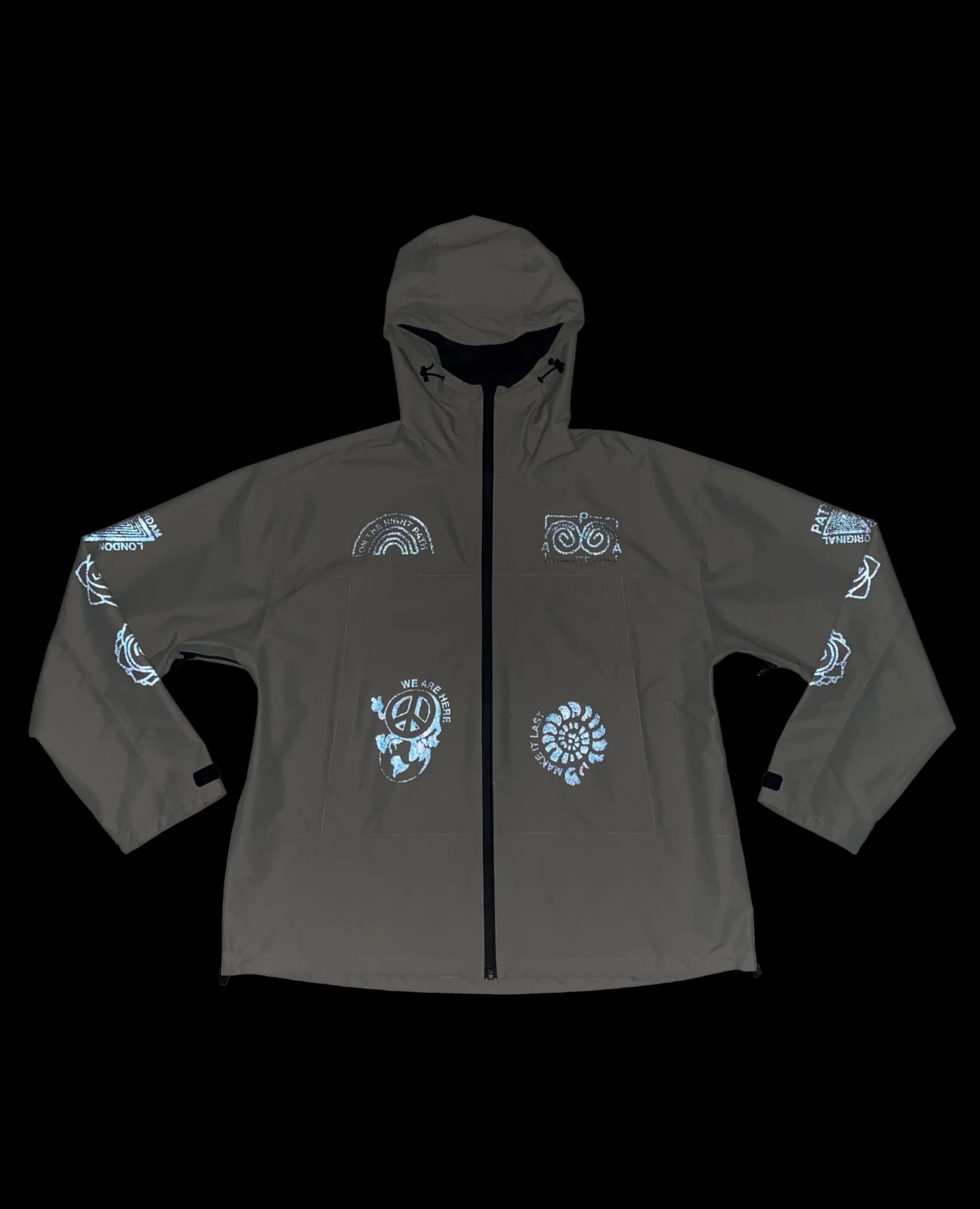 The Patta Waterproof Reflective Shell Jacket is constructed in 100% polyester and is 100% water-repellent. Offering protection through a waterproof membrane, taped seams and aquaguard zips. The Shell Jacket is equipped with elastic cords at the hem and hood, zips at armpits for ventilation, two side pockets with zips and an interior pocket. Enriched with screenprinted 3M reflective prints allover and a small Patta script logo on the back.