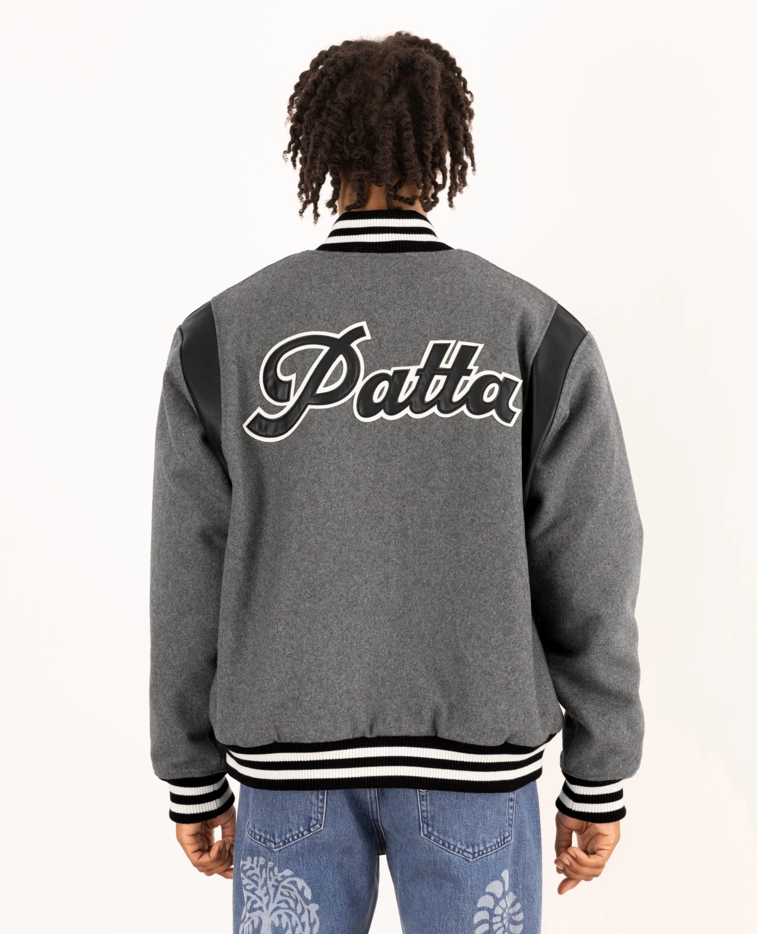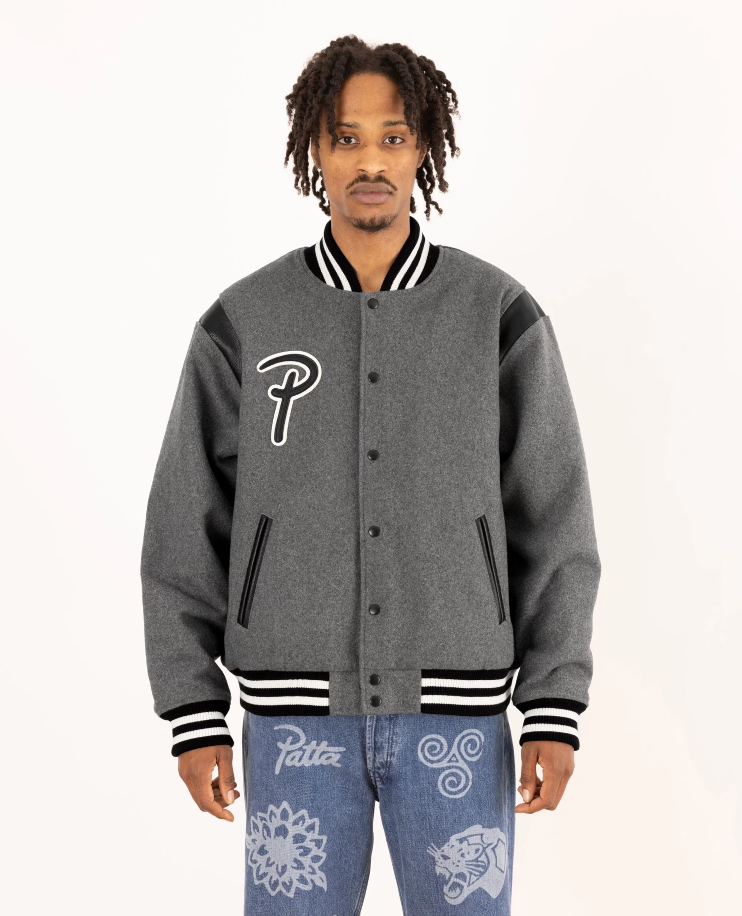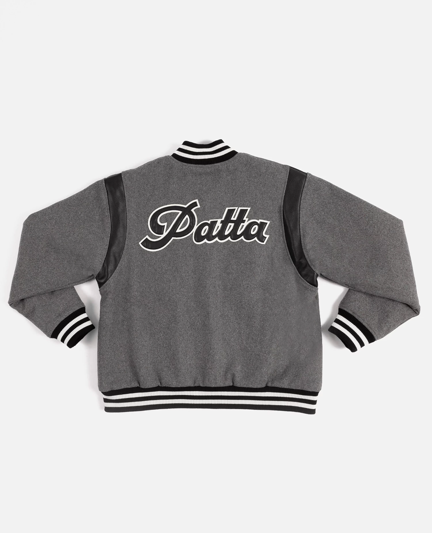 The Patta Wool Sports Bomber Jacket is made from 100% Melton Wool and is equipped with Quilted Polyester lining. The Bomber Jacket features two side pockets, an internal pocket, metal snap buttons and collegiate style ribbings. Enriched with leather sleeve inserts and Patta Leather Applique branding.