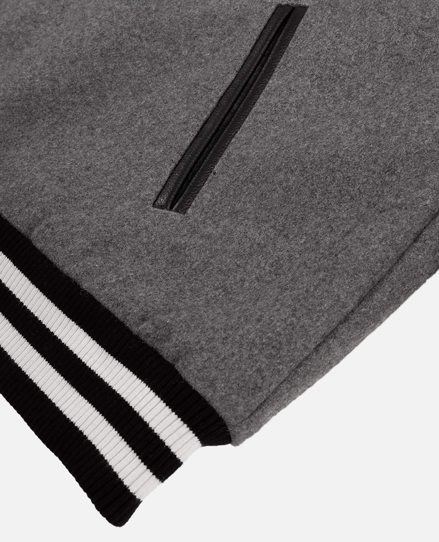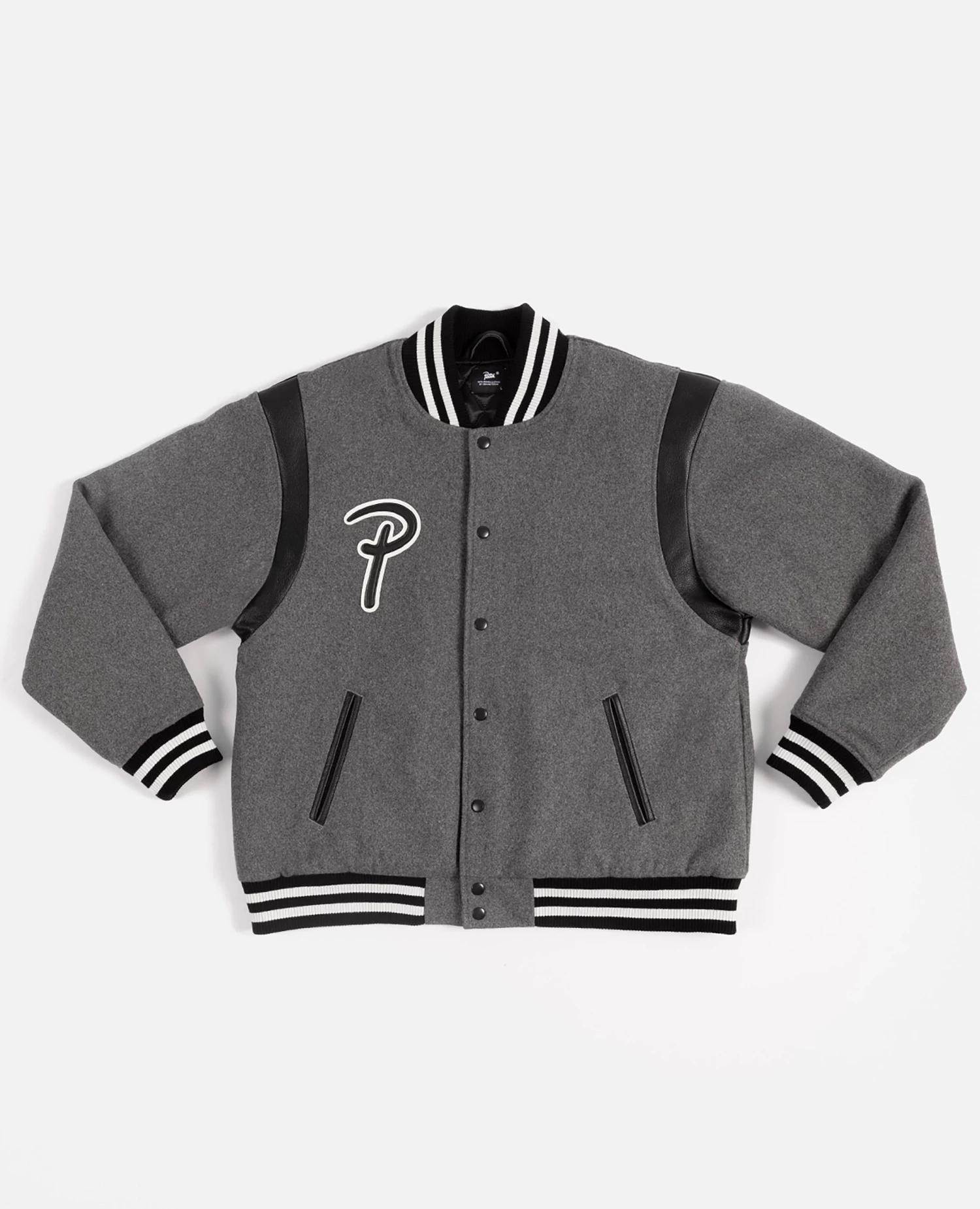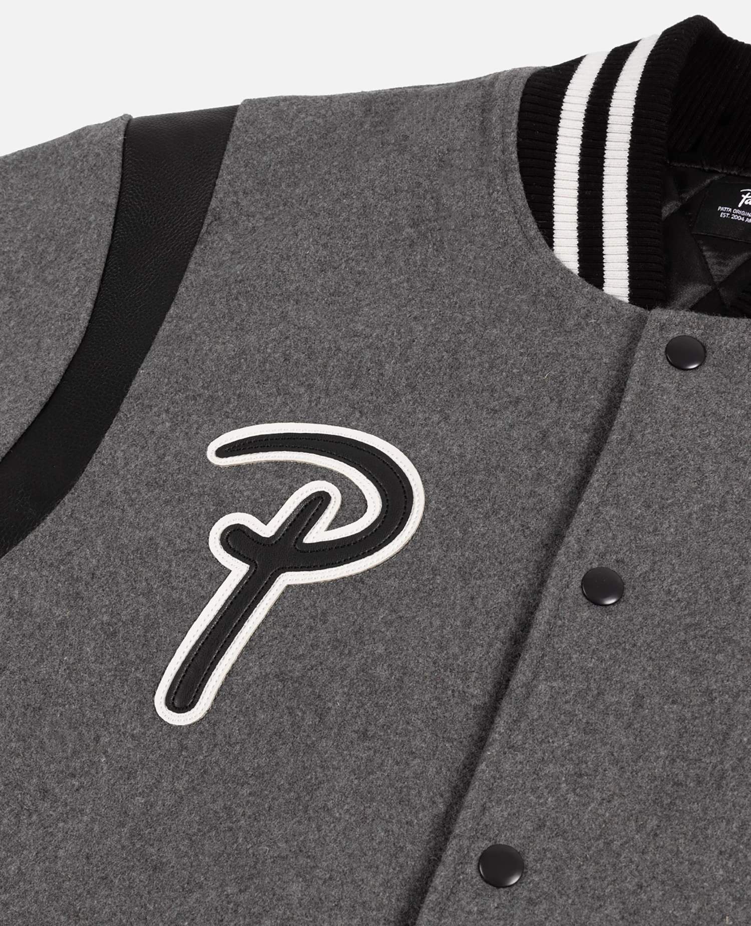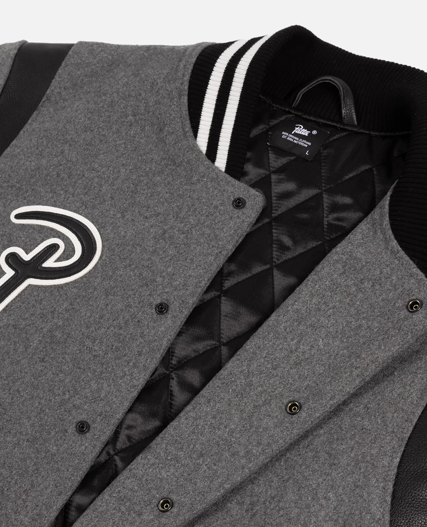 The Patta Wool Sports Bomber Jacket is made from 100% Melton Wool and is equipped with Quilted Polyester lining. The Bomber Jacket features two side pockets, an internal pocket, metal snap buttons and collegiate style ribbings. Enriched with leather sleeve inserts and Patta Leather Applique branding.