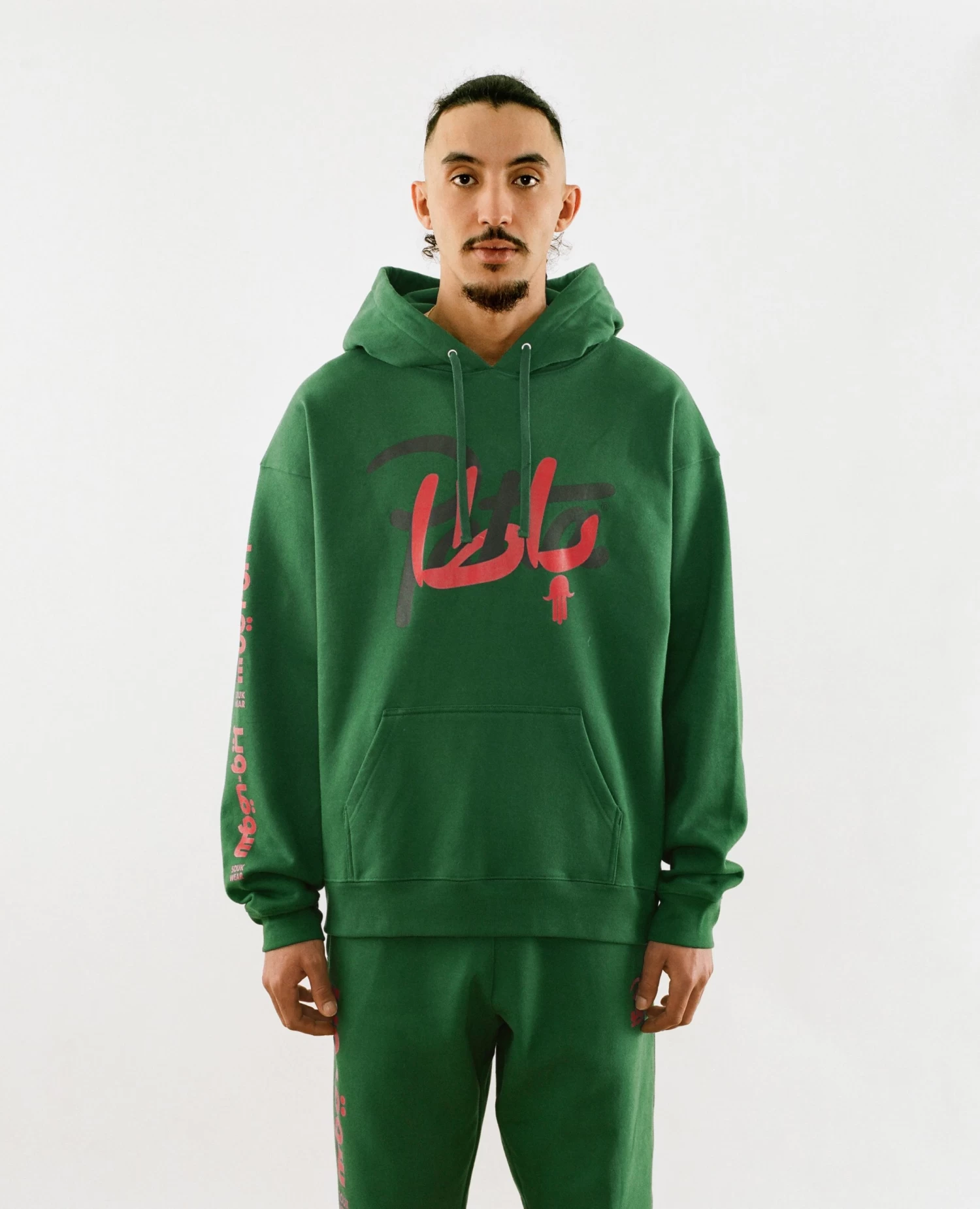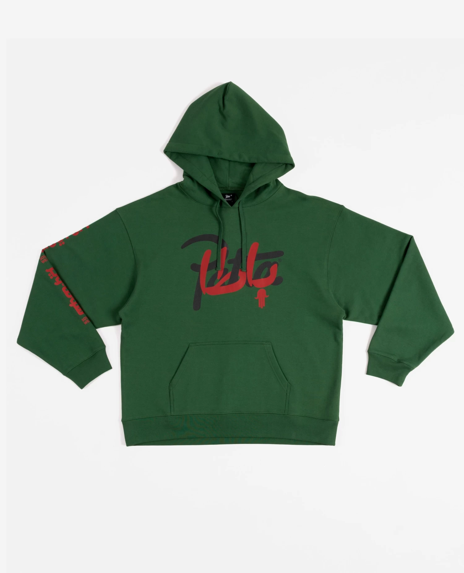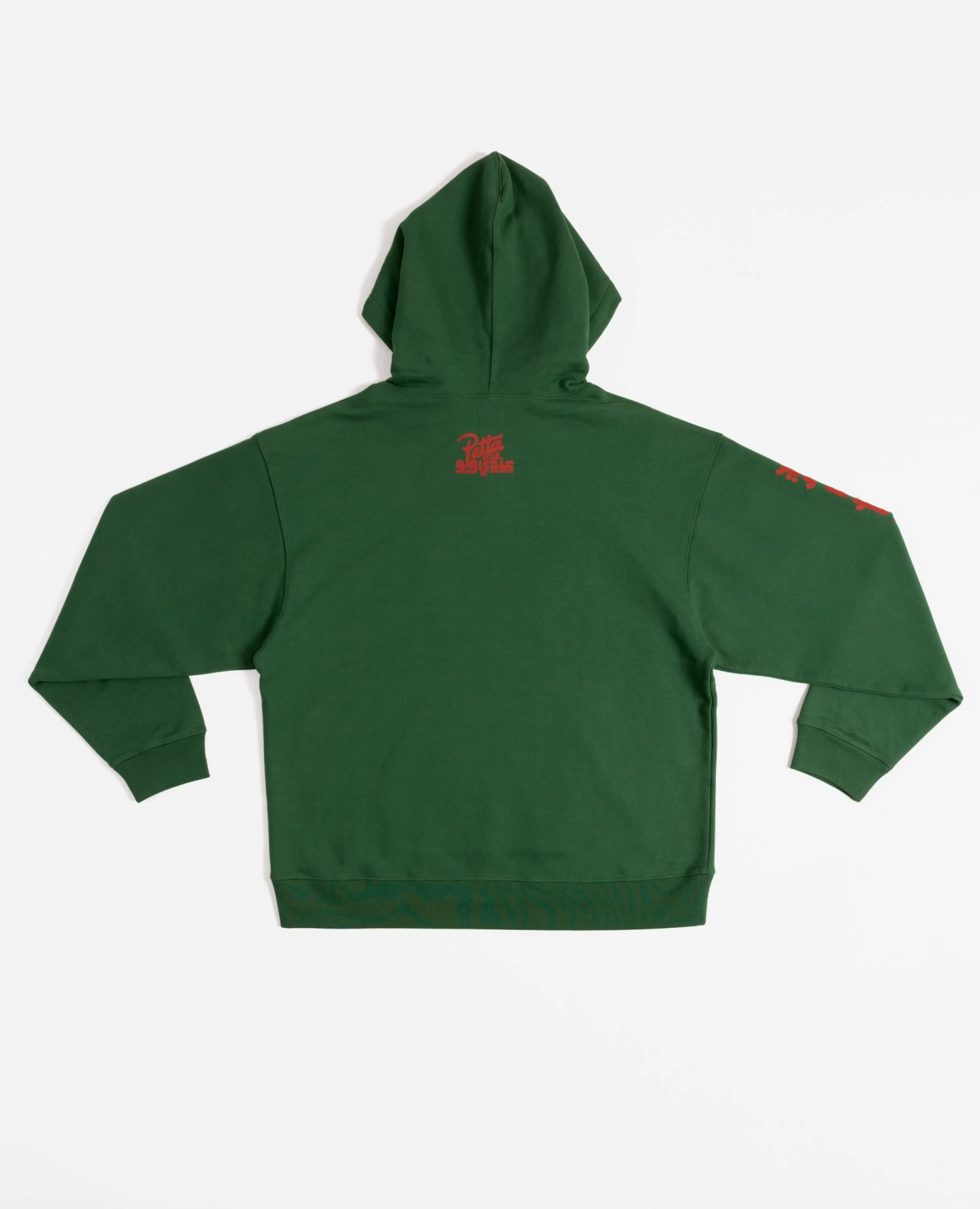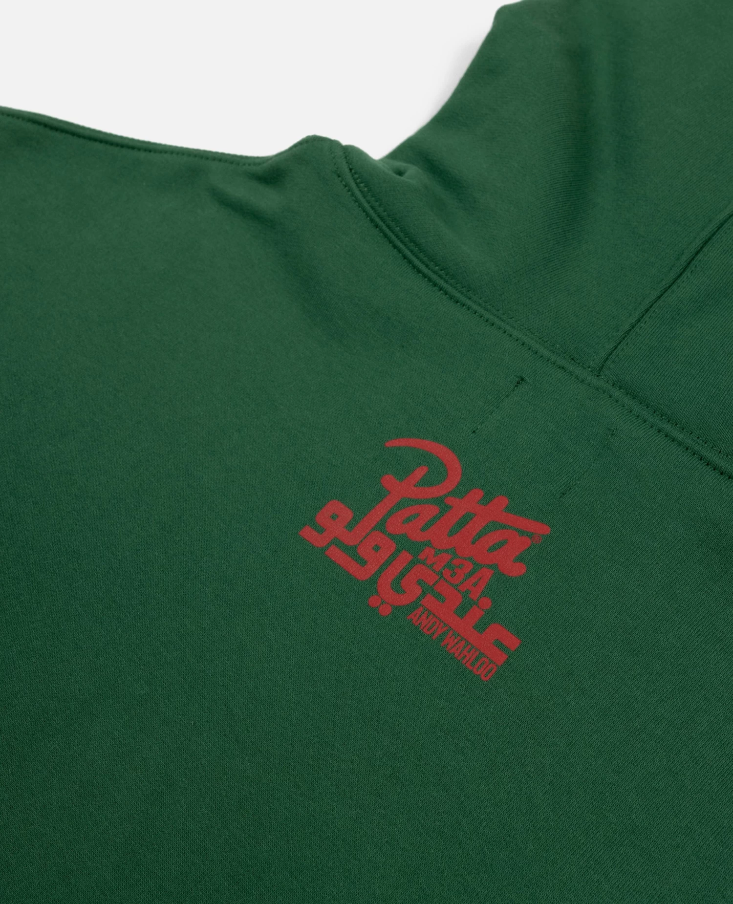 The Patta x Andy Wahloo (Hassan Hajjaj) Boxy Hooded Sweater is produced in 400 gram cotton. It features a kangaroo pocket, ribbed bottom hem with cuffs and a drawstring hoodie. The hoodie is decorated with screen printed Patta x Andy Wahloo artworks on the chest, sleeves and upper back.