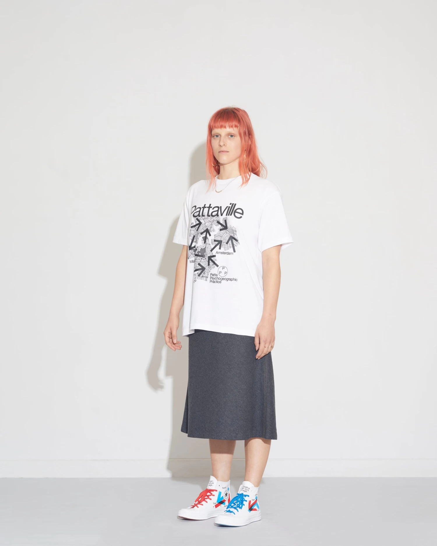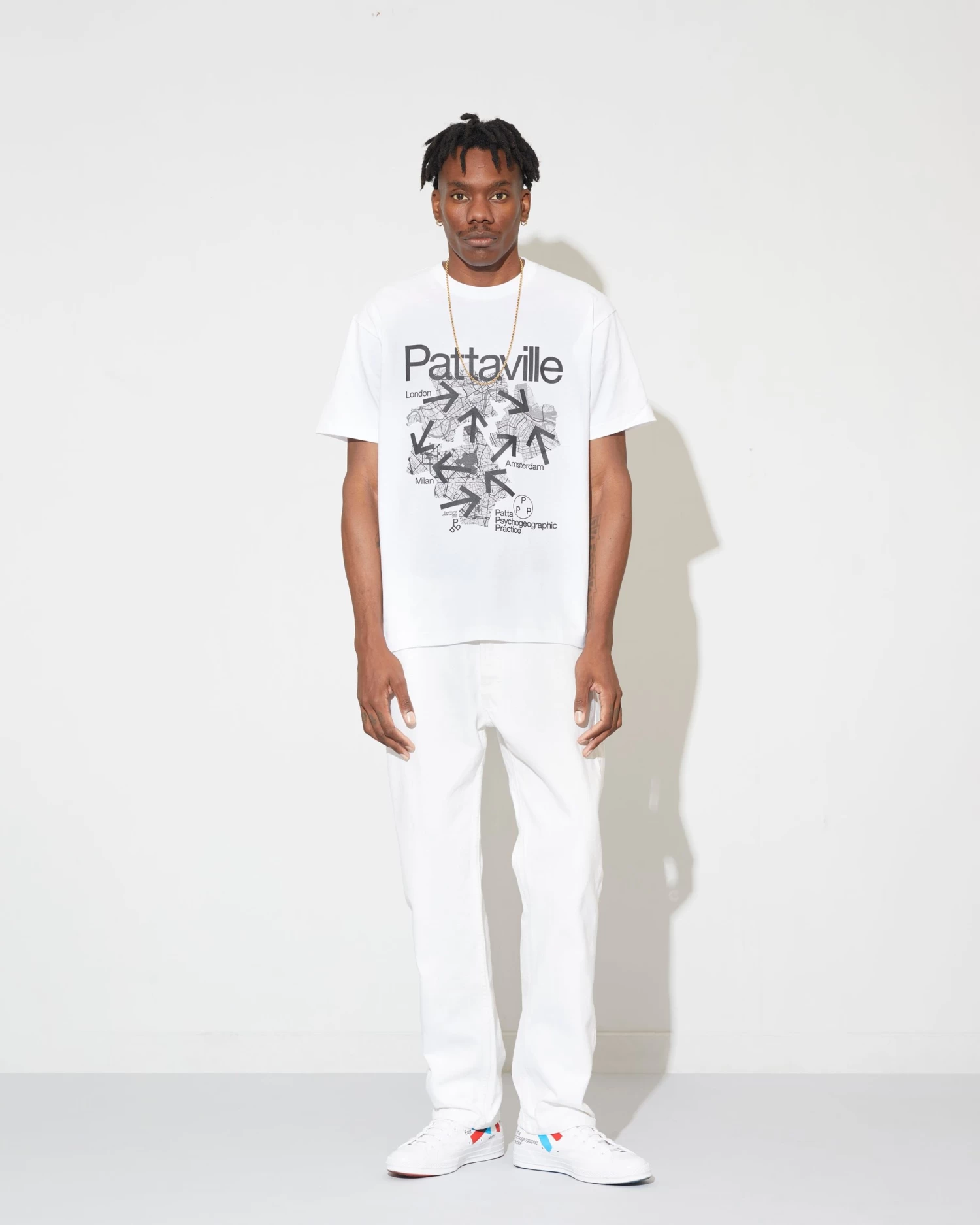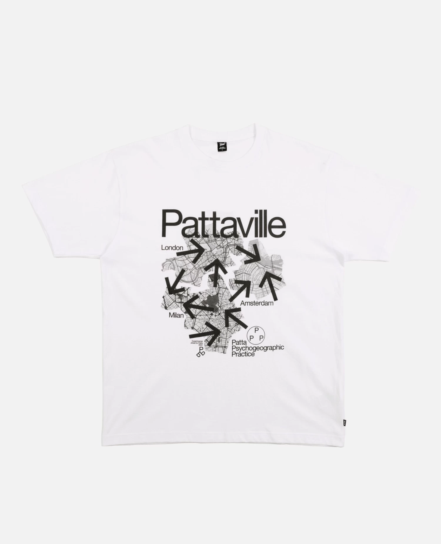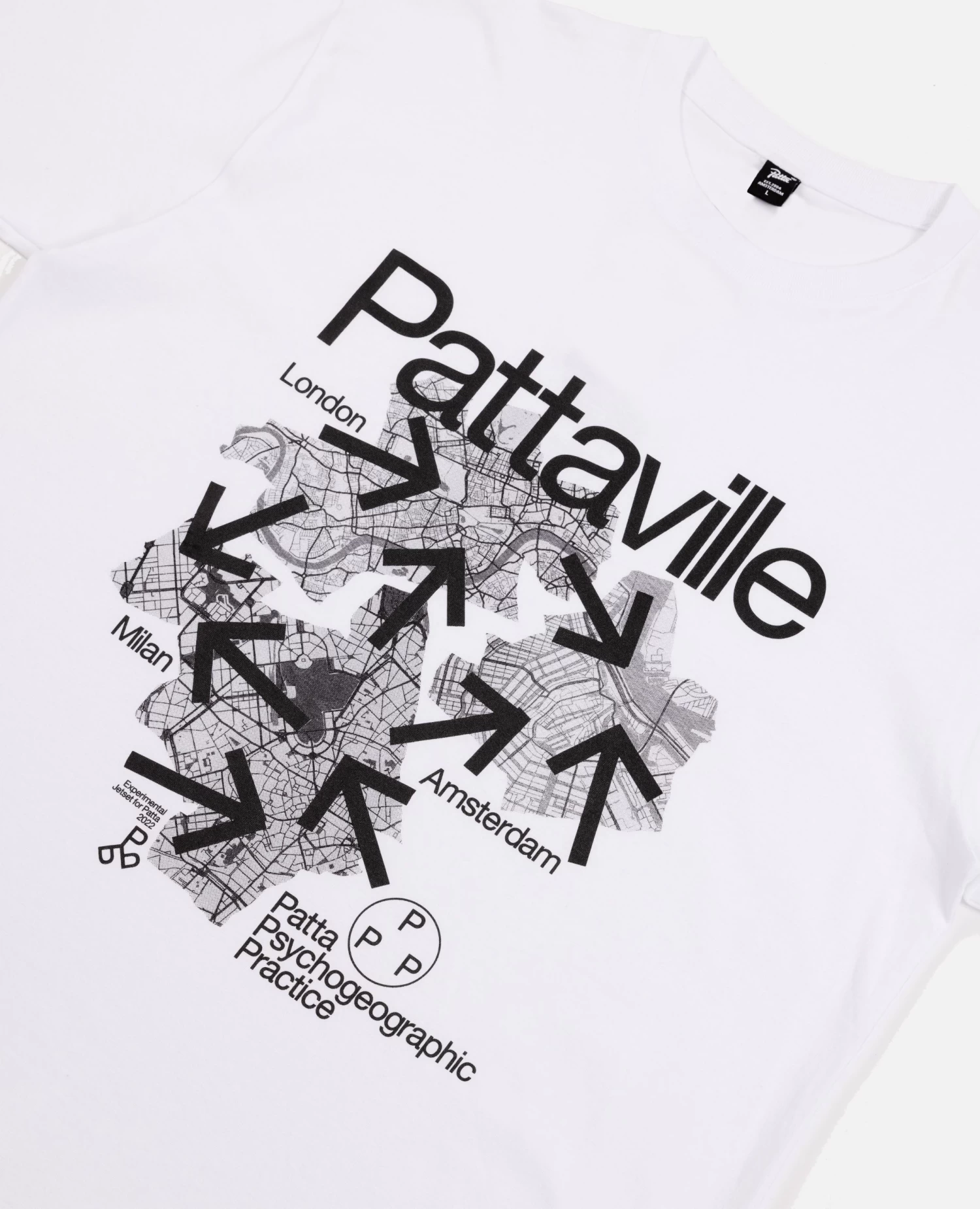 The Patta x Experimental Jetset Pattavile T-Shirt is produced in 180gsm cotton. A Patta woven tab features above the left hand side of the bottom hem. The T-shirt is adorned with a psychogeographic spin. Harnessing the aesthetic of metropolitan maps and directional signage through silk screen graphics on the front. Available in two iterations.