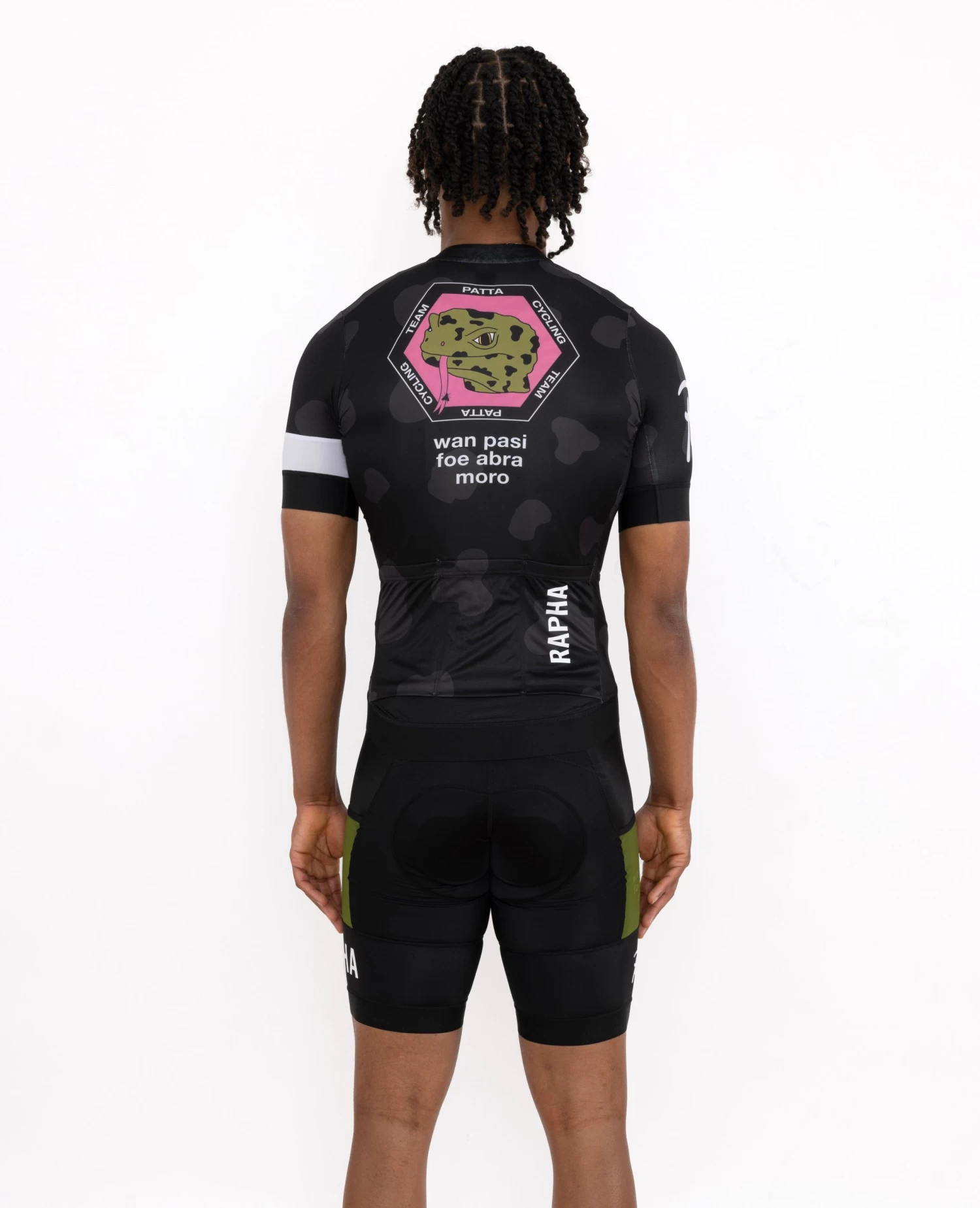 The Patta x Rapha Men’s Training Jersey features lightweight, open-structured fabric on the front panels for sweat wicking and breathability. Close-knit fabric on the back for added sun protection. Wrap-around elasticated grippers on the sleeves and at the hem for a firm but comfortable fit. Three rear pockets carry all your training ride provisions.