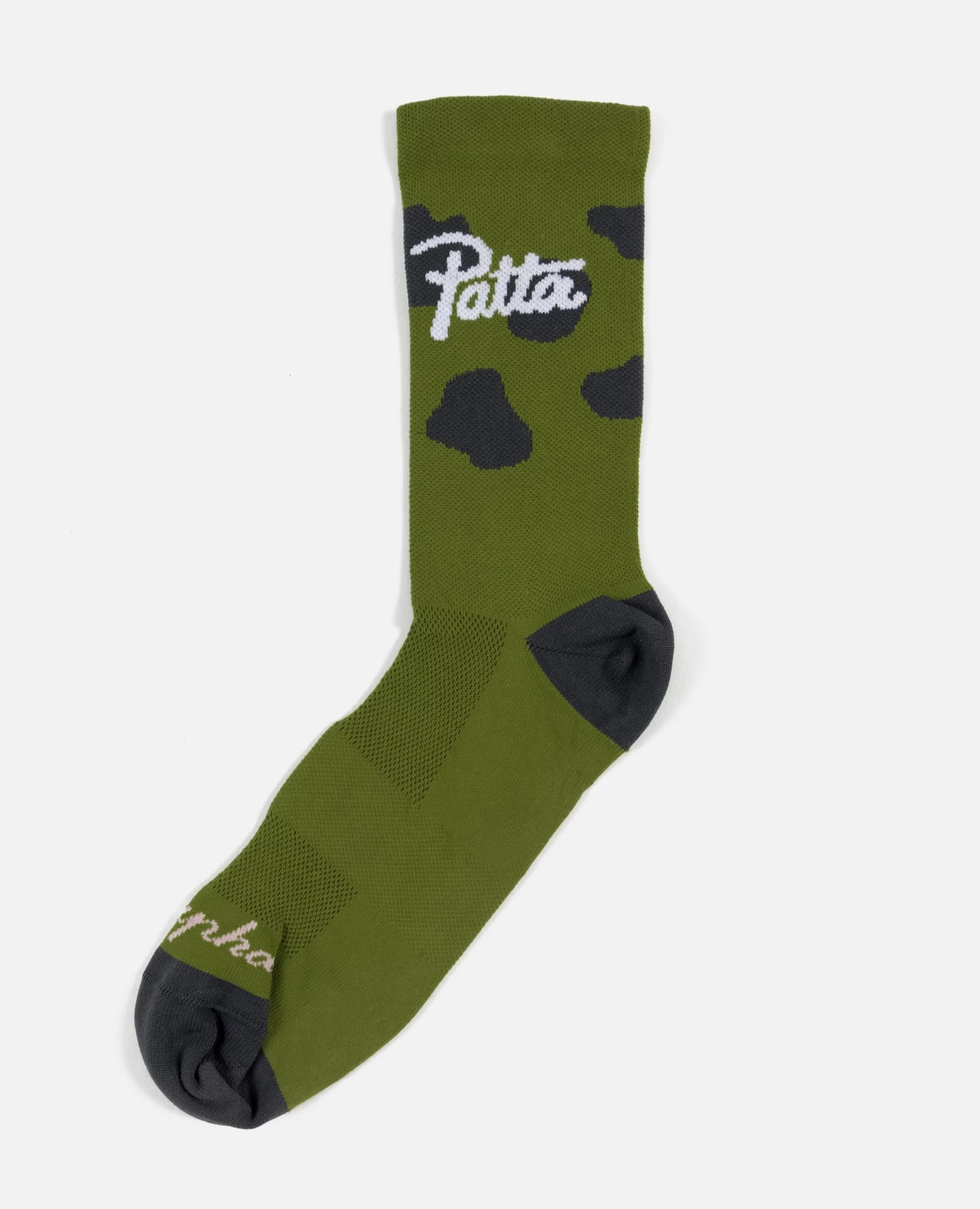 The Patta x Rapha Team Socks feature a high-grade nylon fabric for efficient sweat wicking. Reinforced toe and heel boxes for added durability. Breathable mesh upper section provides temperature regulation. Compressive raised cuff holds the sock in place.