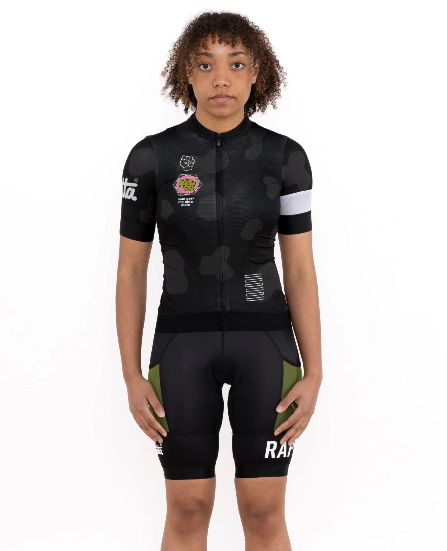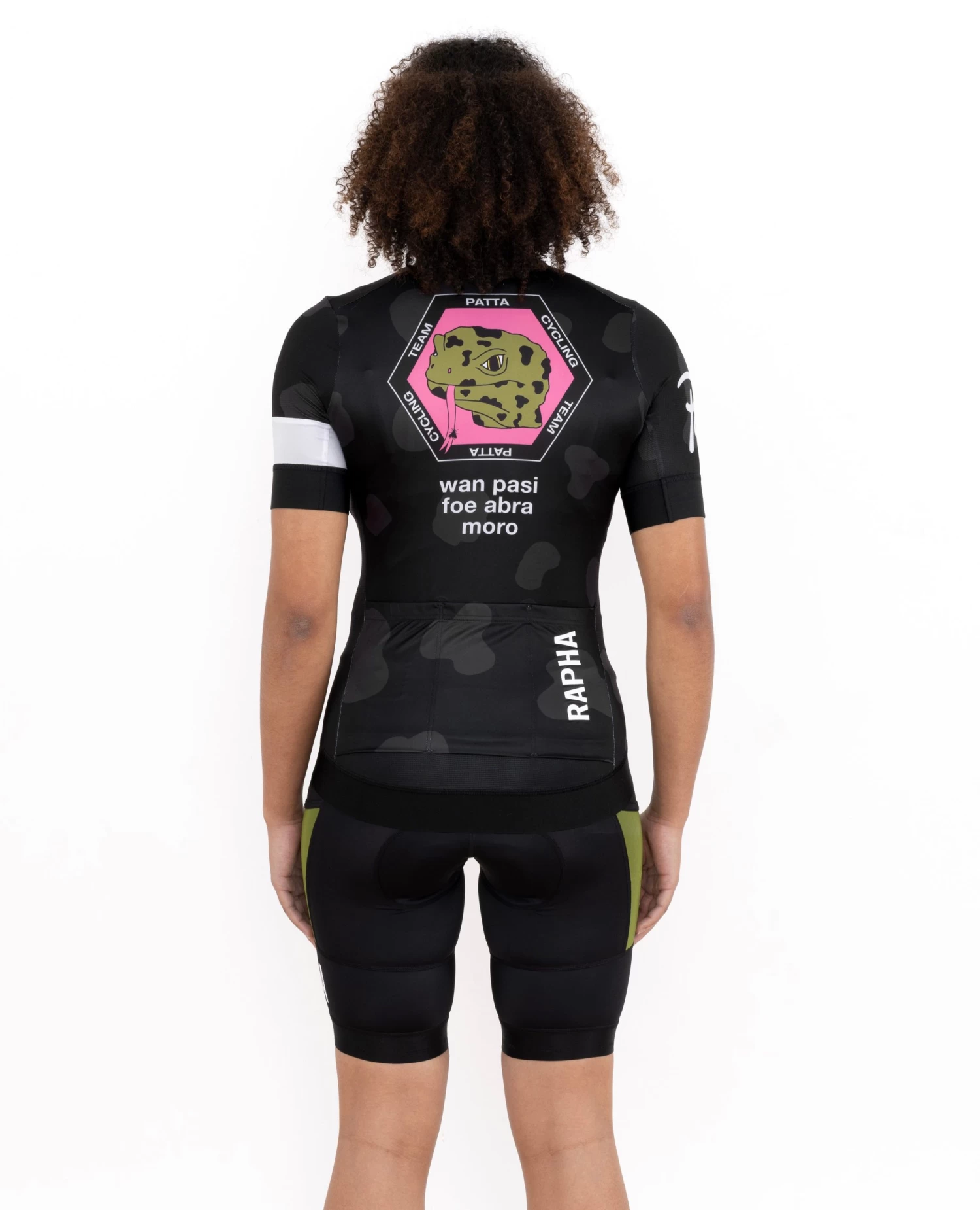 The Patta x Rapha Women’s Training Jersey features lightweight, open-structured fabric on the front panels for sweat wicking and breathability. Close-knit fabric on the back for added sun protection. Wrap-around elasticated grippers on the sleeves and at the hem for a firm but comfortable fit. Three rear pockets carry all your training ride provisions.